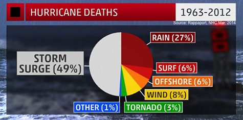While we normally think of the wind being the most life threatening factors of a hurricane, it is not. Instead, the large amount of water the storm generates (storm surge/flooding/rain/surf) account for 82% of deaths. While not tracked by the National Oceanic and Atmospheric Administration (NOAA), accidents within the clean up and recovery efforts, such as falling tree limbs, slip and falls down stairs where there is no electricity, driving accidents from washed out roads and improper usage of generators, gas grills, etc. are also contributors for lives lost after the storm passes.