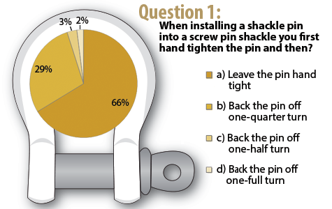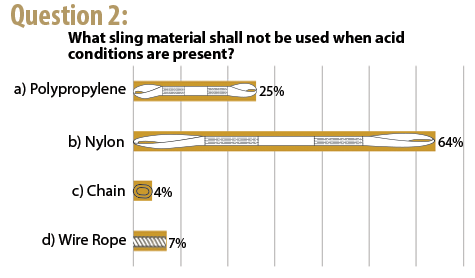 We were glad to note that the majority of responses knew that using at least one type of synthetic sling material would be a cause for concern in an acid environment; however, it is important to know which one. The correct response is b) Nylon.