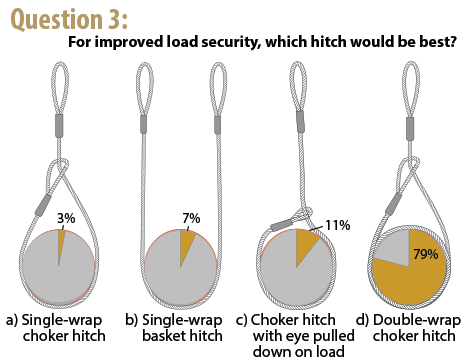 Hands down, when you want load security answer d) Double-wrap choker hitch is the correct response, over the other options given and 79% of respondents agreed. A double-wrap choker hitch provides full contact with the load and if more than one object is being lifted at a time, it will draw the objects together without damaging the sling.