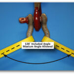- If a shackle is being used with two slings, and is symmetrically loaded, the maximum included angle of 120-degrees may be utilized up to the full Working Load Limit (WLL) if the manufacturer allows. See Figure 2.