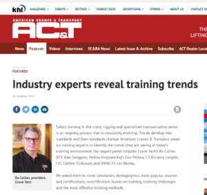 Safety training in the crane, rigging and specialized transportation sector is an ongoing process that is constantly evolving. Trends develop into standards and then standards change. In a recent edition, American Cranes & Transport magazine asked six training experts to identify the trends they are seeing in today’s training environment. Crane Tech was one of those experts and here’s what Bo Collier our President had to say: