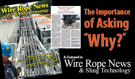 A Crane Tech article was featured in the June edition of Wire Rope News & Sling Technology. The article was on a topic we are very passionate about… crane safety and the importance of asking “Why?”  when there are accidents, incidents and near misses. The article reviews 3 real-life circumstances to show case why asking “Why?” can make a difference in the future safety of operations.